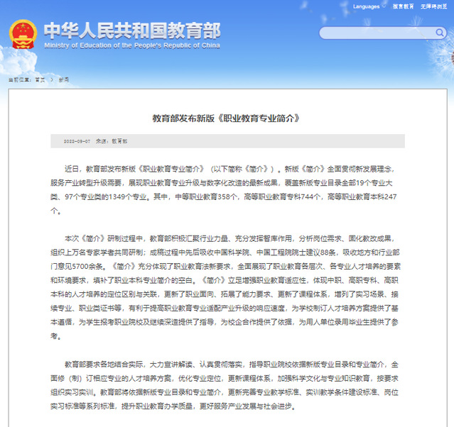 2021年,教育部发布的新版《职业教育专业简介》,是介绍专业基本信息与人才培养核心要素的标准文本,覆盖新版专业目录全部19大类、97个专业类的1349个专业。其中,中等职业教育358个,高等职业教育专科744个,高等职业教育本科247个。
