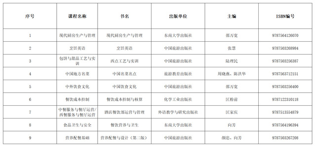 为加强对教学工作的指导,促进教材选用工作更加科学、可行,根据《南京旅游职业学院教材管理办法》,现将烹饪与营养学院2022-2023学年第1学期2021级学生选用教材公示如下: