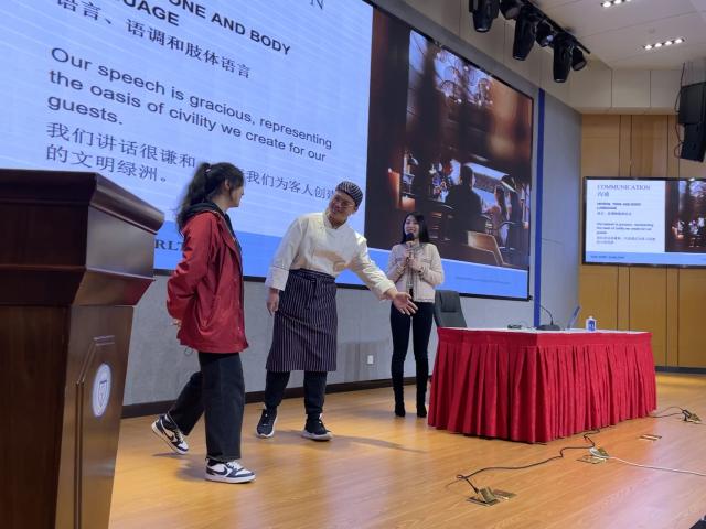 职业礼仪讲座由烹饪与营养学院副院长王艳玲主持,并邀请了南京丽思卡尔顿人力资源副总监赵文为大家讲解职业礼仪。赵总从服务价值观引入,向大家介绍了语音、语调和肢体语言的重要性以及疫情背景下的职业礼仪规范。赵总还通过现场教学互动,让大家深深地感受到了职业礼仪的魅力。同学们纷纷表示在今后的工作生活中,会更加注重礼仪形象,严格要求自己,展现出良好的职业风貌。