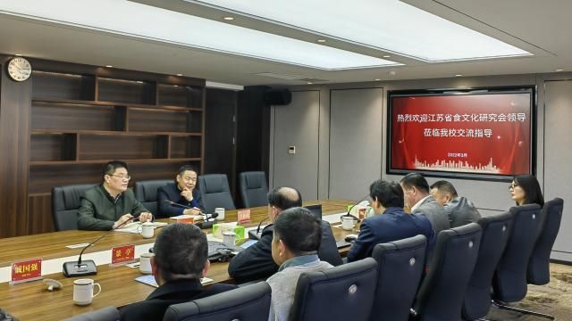 2022年3月3日下午,江苏省食文化研究会常务副会长秘书长吴志强、副会长常务秘书长殷文景、副会长沈建平、监事会主席朱可江、《中国食文化通史》编辑委员会办公室主任景亭、文化艺术委员会副主任王秀丹、副秘书长戚国强、秘书处秘书唐媛一行八人来我校交流指导。南京旅游职业学院校长叶凌波和烹饪与营养学院院长吕新河参加会议。