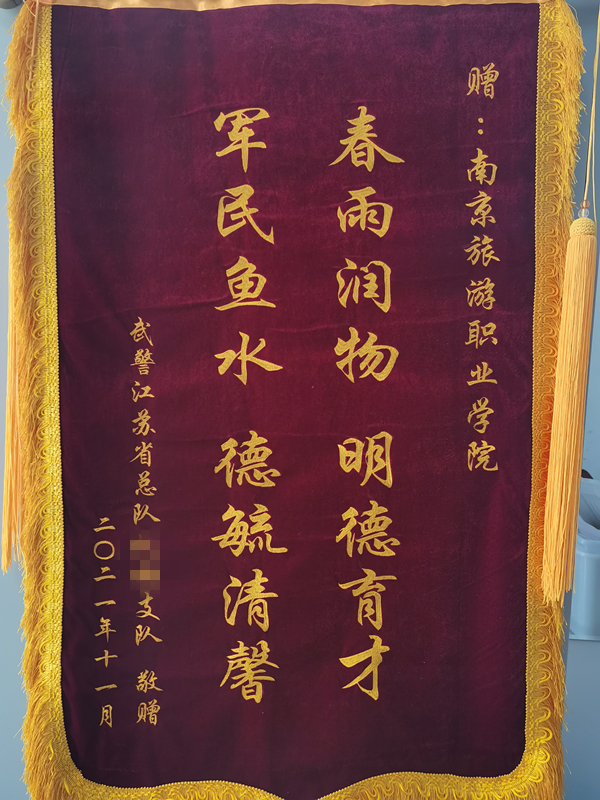 2021年11月29日,中国人民武装警察部队江苏省总队某支队代表专程到访我院,感谢近年来烹饪与营养学院为武警江苏总队厨艺培训提供的支持与帮助,并为我院送来了锦旗和感谢信。南京旅游职业学院党委书记周春林代表学校接受了锦旗,烹饪与营养学院院长吕新河、党总支副书记徐金华及副院长王艳玲参加了座谈,双方就今后加强共建活动进行了深入交流。