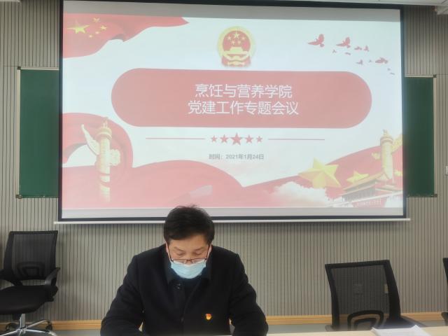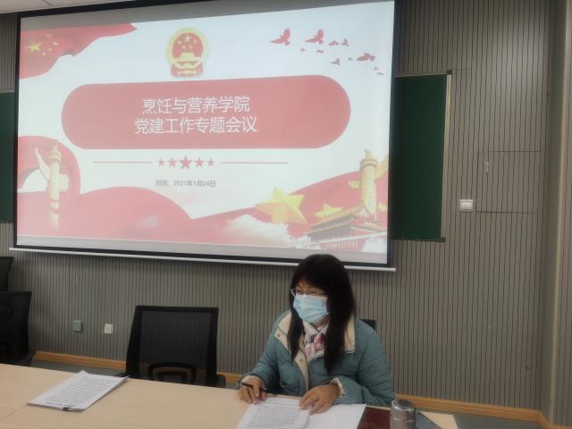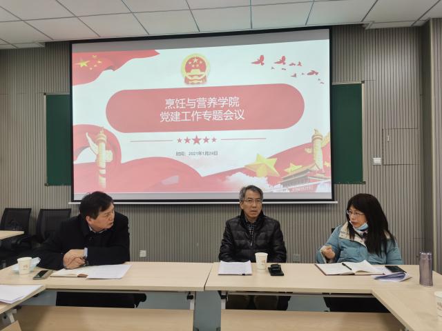 烹饪与营养学院教工党支部书记史红根汇报了2020年教工党支部“全国样板党支部”建设情况,并着重强调党支部建设必须深入贯彻习近平新时代中国特色社会主义思想和党的十九大精神,重在建设、典型引领、整体推进,希望2021年在喜迎中国共产党成立100周年之际,经过凝神聚力的建设,教工党支部以优异的成绩通过全国样板党支部培育验收。