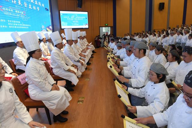 大会致辞环节结束后,是隆重的拜师仪式。在司仪的引领下,南京旅游职业学院图书馆报告厅内,350名身穿整齐厨师服装的大学生,齐刷刷地向36位“大厨”师父鞠躬行礼,齐读《拜师帖》。作为回礼,师父们向徒弟宣读《回徒帖》,并将《回徒帖》赠予学生代表从而正式确立师徒关系。随后,徒弟代表与师傅代表先后上台进行发言,并一同上台合影留恋,记录下了他们人生当中一段珍贵的回忆。