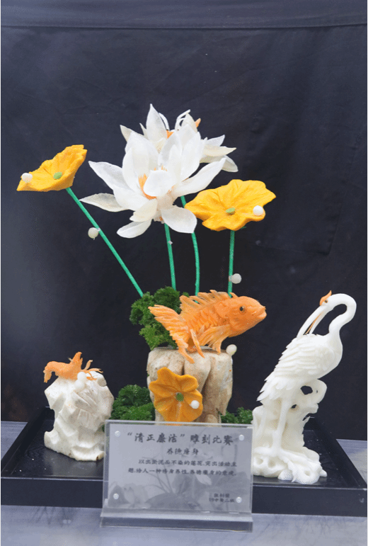 参赛选手们用一把把雕刻刀,把萝卜、南瓜、莴笋等各种食材以具有清正、廉洁寓意的菊、莲、竹、月等自然事物为表现主体打造出自己心中的清廉文化作品。果蔬雕刻完美的将形、色、意有机融合为一体,作品生动鲜活,栩栩如生,令人叹为观止。