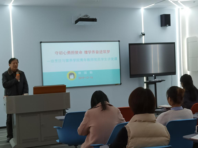 为贯彻党的十九大精神和习近平总书记对做好关心下一代工作的系列指示,提高青年教师的师德师风和职业素养,12月16日下午烹饪与营养学院关工委邀请退休老党员胡国勤同志在实训楼201教室为青年教师、学生入党积极分子讲授了“不忘初心、牢记使命”主题教育党课,党课主题为“守初心勇担使命,增学养奋进筑梦”,活动由烹饪与营养学院关工委主任、党总支副书记胡爱英主持。