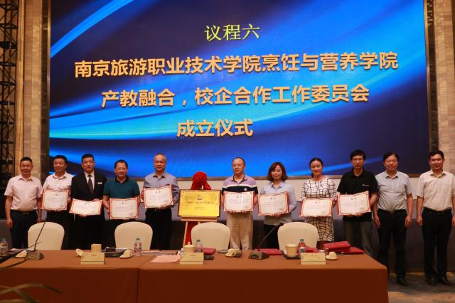会上举行了烹饪与营养学院产教融合、校企合作工作委员会成立与揭牌仪式,周春林院长宣读了南旅院烹饪 [2018] 8 号《南京旅游职业学院烹饪与营养学院关于成立产教融合、校企合作委员会的决定》,周春林院长和吕新河院长共同为烹饪与营养学院产教融合、校企合作工作委员会揭牌并为受聘委员颁发聘书。