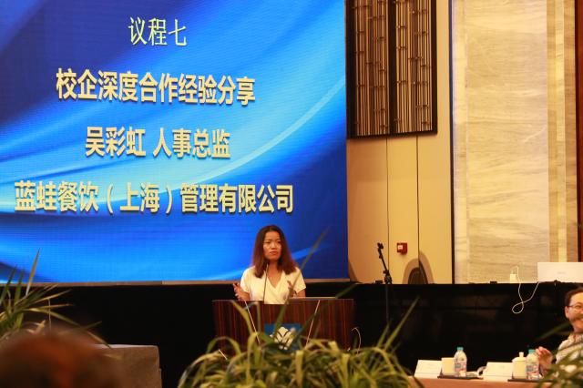 为推动产教深度融合,本次会议还由蓝蛙餐饮(上海)管理公司的人力资源总监吴彩红与夜上海餐饮有限公司董事长夏明龙进行了校企深度合作的经验分享以及校企协同育人主题研讨与分专业交流。