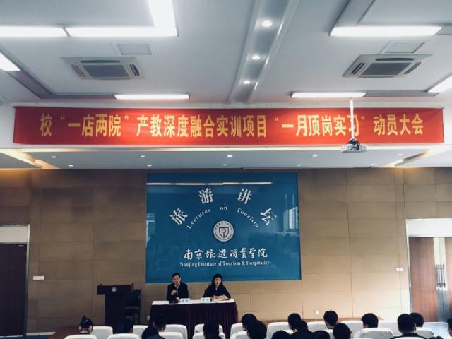 2018年5月2日上午,烹饪工艺与营养学院、酒店管理学院在2号教学楼报告厅联合召开2018年度“一店两院”产教深度融合“一月跟岗”项目的动员大会。烹饪工艺与营养学院副院长颜忠、酒店管理学院副院长苏炜出席会议,173级烹调工艺与营养专业单招1班、2班,173级酒店管理专业“3+3”1班、2班共120余名同学参加会议。