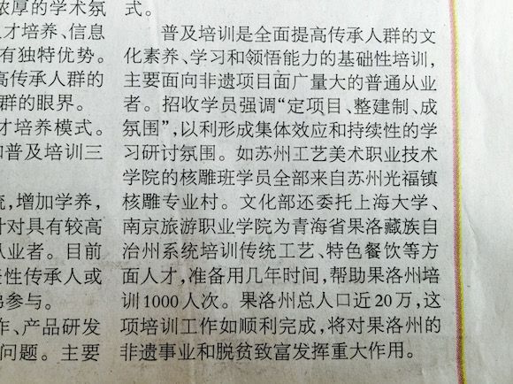《光明日报》刊登的文章提到:“普及培训是全面提高传承人群的文化素养、学习和领悟能力的基础性培训,主要面向非遗项目面广量大的普通从业者。文化部委托上海大学、南京旅游职业学院为青海省果洛藏族自治州系统培训传统工艺、特色餐饮等方面人才,准备用几年时间,帮助果洛州培训1000人次。果洛州总人口近20万,这项培训工作如顺利完成,将对果洛州的非遗事业和脱贫致富发挥重大作用。”