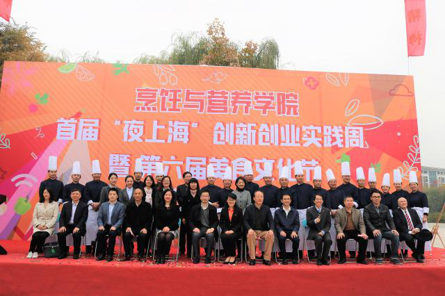 凉风送爽,丹桂飘香,2017年11月13日上午9时30分,南京旅游职业学院烹饪与营养学院首届“夜上海”创新创业实践周暨第六届蓝蛙美食文化节在马踏飞燕广场举办了盛大的开幕典礼。出席开幕典礼的嘉宾有江苏省委第四巡视组副组长邱正祥及巡视组各位领导、南京旅游职业学院党委书记王海平、南京旅游职业学院校长周春林及各部门领导、南京月尚夜上海餐饮管理有限公司董事长夏明龙和UNWTO旅游教育质量认证专家Dr. Daniel Payron。