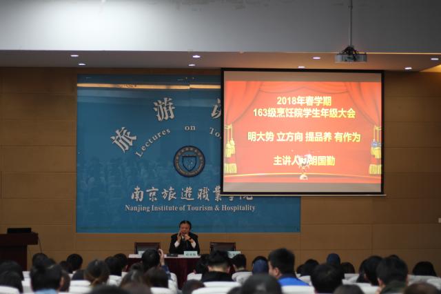 2017,年3月14日下午5点。烹饪与营养学院在2号教学楼。举行163新学期年级大会。党支部书记胡国勤老师主持下召开了春季年级大会,擂响新学期的战鼓。学生党支部书记王恭博老师、各班级班主任及级学生全员到齐。