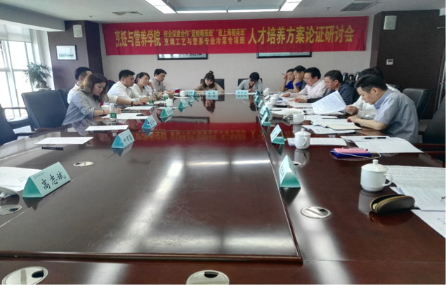 为稳步推进校企深度合作,积极参与示范校建设,5月8日,烹饪与营养学院在行政楼411会议室召开了2017年校企深度合作专项班人才培养方案论证研讨会,会议围绕“蓝蛙精英班”、“夜上海精英班”和“冷菜专项班”的人才培养方案进行了研讨。南京旅游学院副校长田寅生、教务处处长方法林,烹饪与营养学院副院长吕新河、颜忠,蓝蛙餐饮(上海)管理公司人力资源总监吴彩虹、行政副总厨吴健,南京月尚夜上海餐饮公司星湖美景总经理高志和、厨师长叶百昌,以及烹饪学院各教研