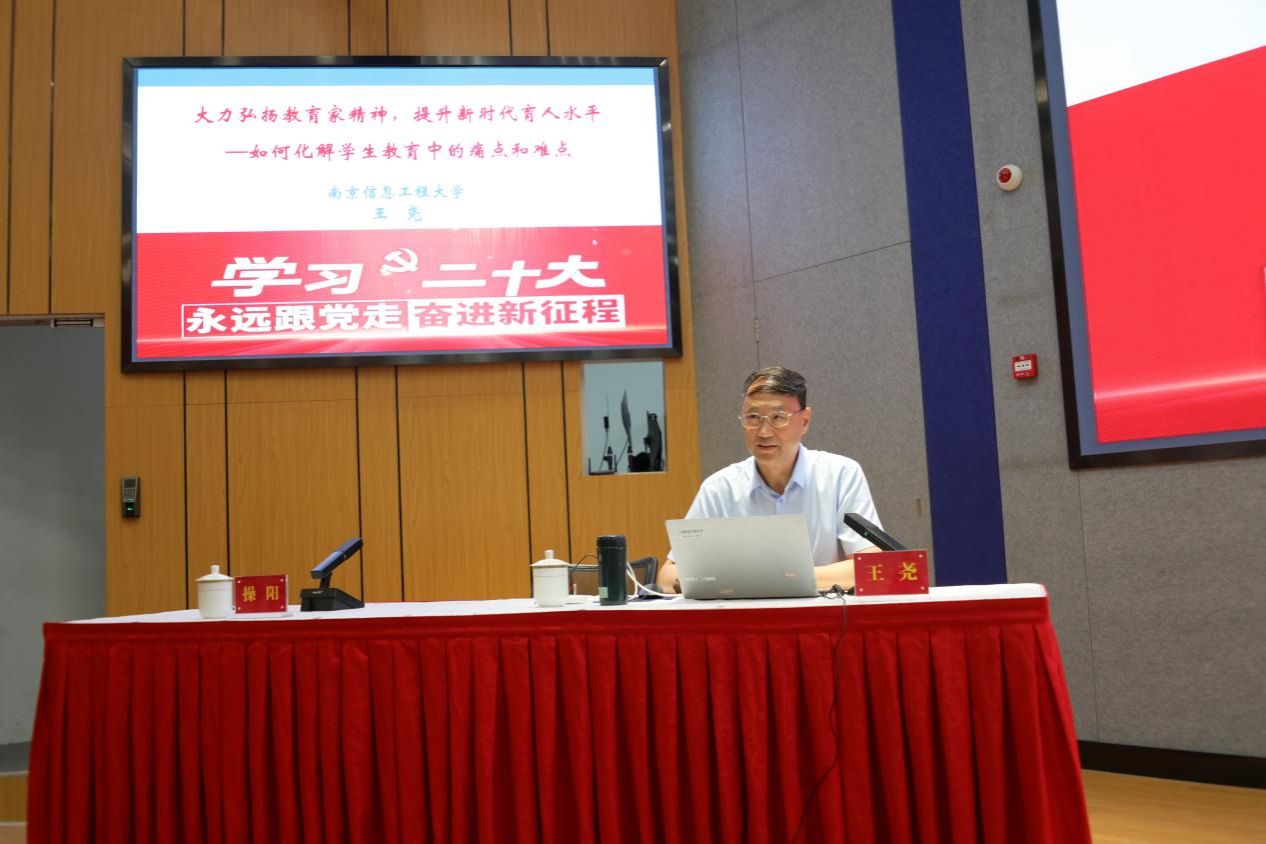 南京信息工程大学原党委副书记、副校长王尧教授以《大力弘扬教育家精神,提升新时代育人水平 ——如何化解学生教育中的痛点和难点》为主题和老师们分享了学生教育管理过程中的经验方法。围绕“培养什么人、怎样培养人、为谁培养人”这一教育的根本问题,从坚守“为党育人、为国育才”的初心使命出发,结合从事学生教育管理的丰富经验,列举了高校育人工作中存在的普遍问题,分析了当前学生教育管理中的痛点、难点及其成因,分享了自己的理论研究和南京信息工程大学的成功实践经验。针对学生教育的痛点与难点,王尧教授认为,一是学校要构建“三全育人”思政体系和机制,增强“实感”;二是部门要组织实施切实有效的教育管理措施,增强“力感”;三是全体学工系统教师要掌握必要的思想政治教育方法,增强“手感”。