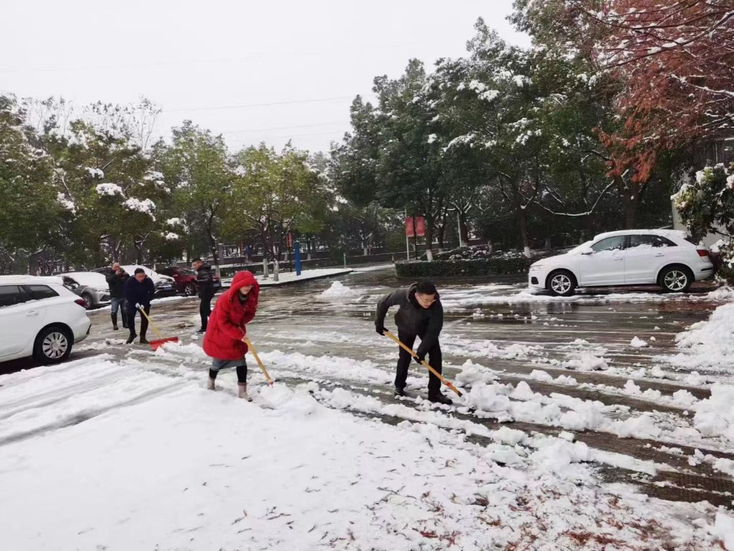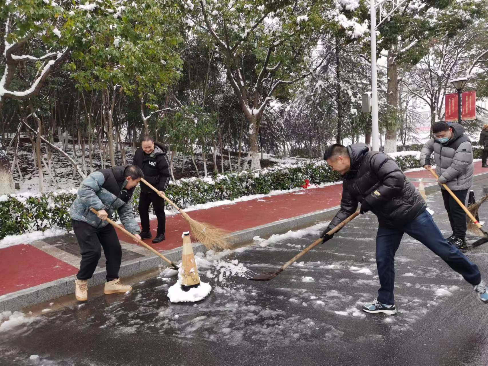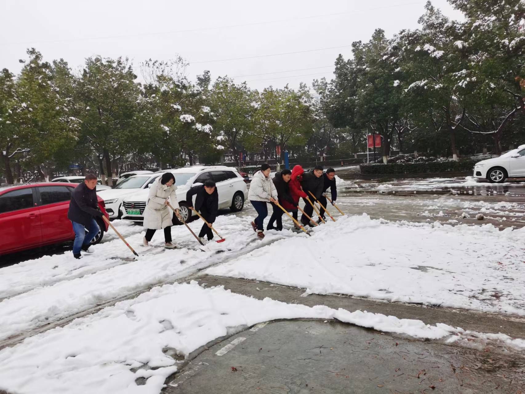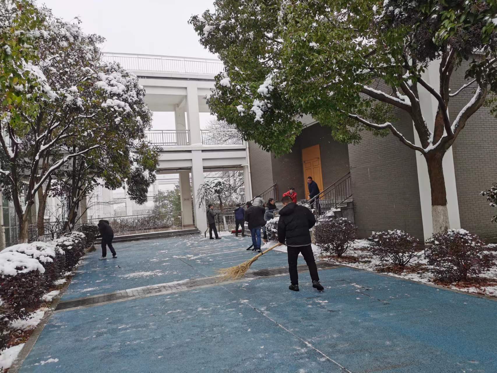 活动中,支部党员用扫雪除冰这一最朴素的方式践行党员的责任担当。大家拿着清雪工具,将路边残留的积雪清扫干净并集中堆放,人行道、停车场、教学区,全体党员同志齐心协力、干劲十足,忙碌的身影在校园里构成了一道亮丽的风景线。