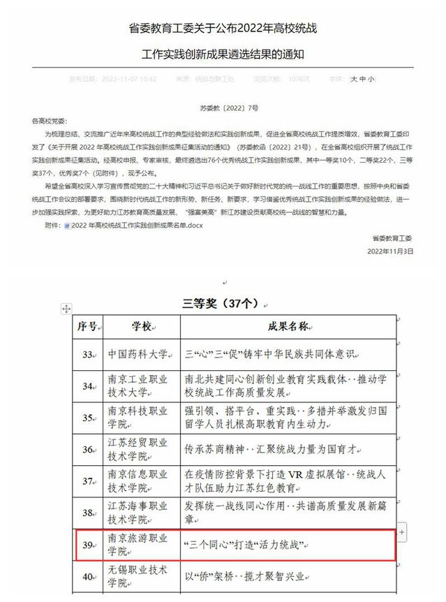 近日,省委教育工委公布了2022年高校统战工作实践创新成果遴选结果,由学院党委组织申报的《“三个同心”打造“活力统战”》荣获全省高校统战工作创新成果三等奖,彰显了我院统战工作的新成效。