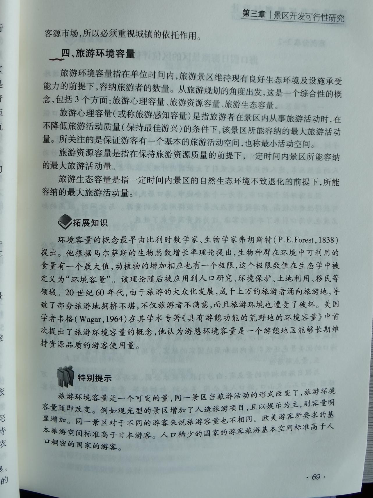 (2)第三章“景区开发可行性研究”中的第三节“景区区位评估”——旅游环境容量P69