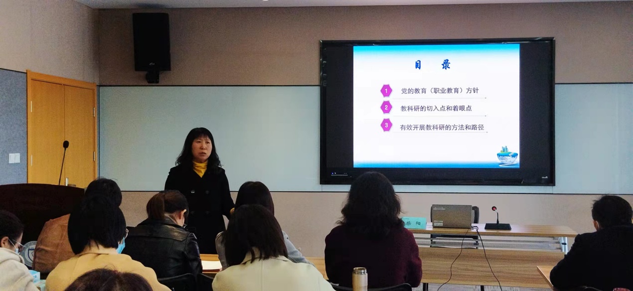 操阳从党的教育(职业教育)方针、教科研的切入点和着眼点、有效开展教科研的方法和路径三个大方面进行介绍,带领全体老师梳理了自改革开发以来我国职业教育发展的重要文件,解读职业教育新理念,着重强调职业教育是一种类型教育的理念;从政策研究、时事研究、常态研究和教师专业优势的切入点和着眼点四个方面,用大量例证深入浅出地让全体老师对教科研选题有了清晰的了解;接着分析了学校教科研课题项目的来源,建议老师根据专业背景和教学方向,采用团队合作的方式,从当前时政热点、难点选取相应课题作为研究方向,围绕课题申报书的各个组成部分,从课题名称、团队成员、课题研究现状述评、课题研究内容、课题主要观点与创新等方面进行细致的指导,并用案例分析的方法,详细分析两份申报书的优缺点。最后操阳以胡适先生“大胆的假设,小心的求证”和傅斯年先生“上穷碧落下黄泉,动手动脚找东西”的名言激励全体教师,希望老师们以乐观、积极、持之以恒和对自己负责的态度,紧密结合专业背景,找准自己未来教科研的目标并付之努力,教科研之路必定会越走越宽!