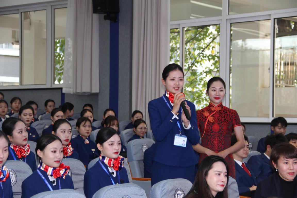 答疑解惑环节,同学们踊跃提问,表达对未来就业的疑惑及如何提高专业技能。中国东方航空江苏公司人力资源部总经理解方耐心解答,鼓励南旅院空乘专业学生要敢于追逐梦想,坚定追梦方向,提高追梦品格,拥有圆梦本领。中国东方航空江苏公司客舱部副总经理林佳艳教诲同学们要时刻做积极的事,说积极的话,不忘初心,珍惜当下。最后我院05级优秀毕业生现任东航江苏公司乘务长兼乘务教员冯青讲述多年来东航乘务员的职业工作经验与感悟,祝愿学弟学妹们早日实现自己的蓝天梦。