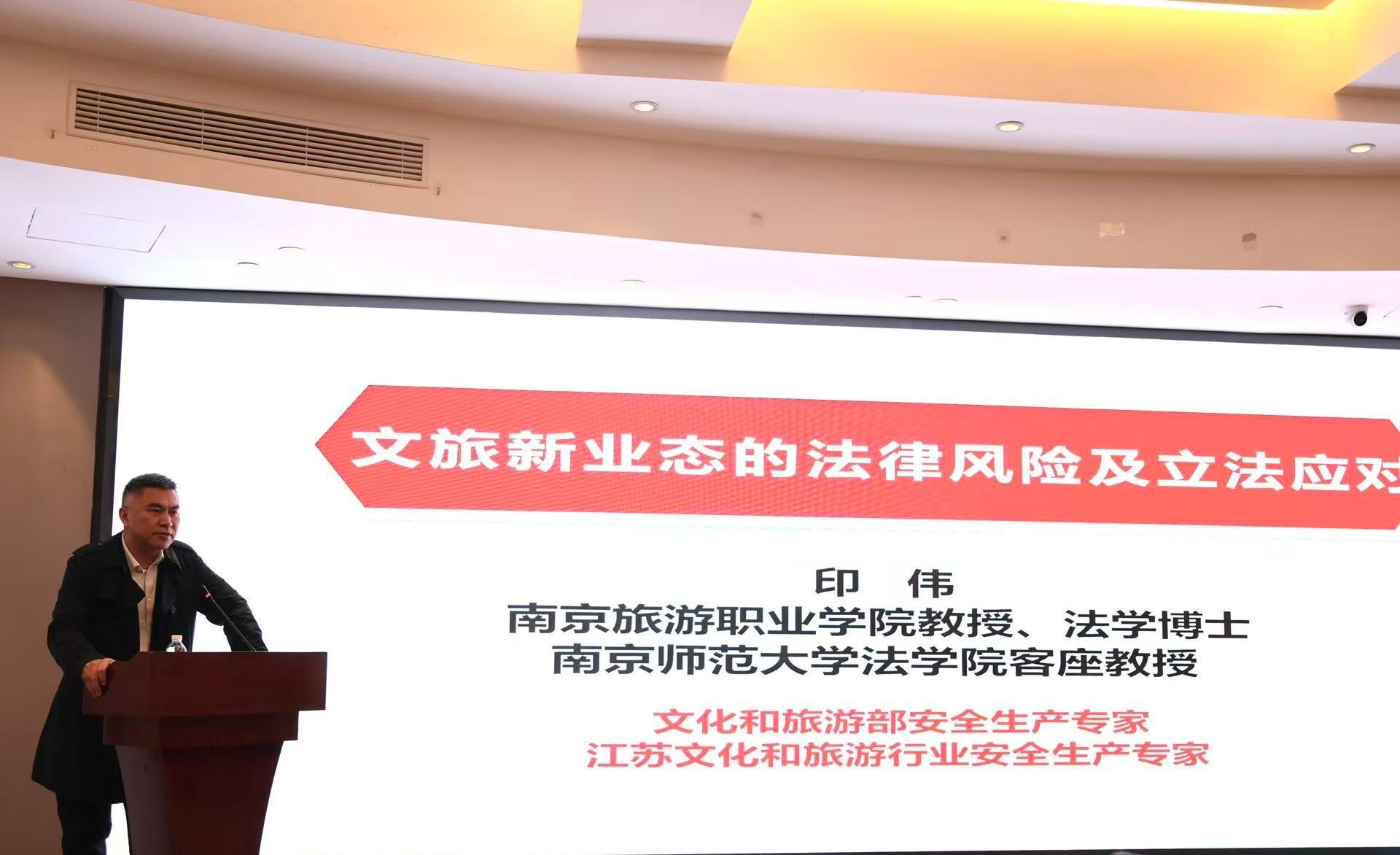 为深化产教融合,洞察行业最新动态,2025年10月25日,旅游管理学院组织师生代表前往御冠酒店,参加了由南京市律师协会主办的“新业态下文旅行业法律风险防范与应对”专题分享活动。我院印伟教授作为特邀主讲嘉宾,在活动中发表了题为《文旅新业态的法律风险及立法应对》的专题报告,其前沿的视角与深度的剖析获得了与会各界人士的高度赞誉。