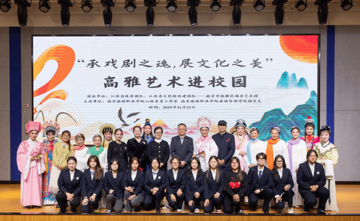 为赓续中华文脉,弘扬戏曲瑰宝,厚植民族文化自信,2025年11月13日18:00,“承戏剧之魂,展文化之美”高雅艺术进校园活动在学校“一站式”社区报告厅隆重启幕。本次活动由南京旅游职业学院心弦美育工作室、旅游管理学院团总支联合主办,特邀南京市鼓楼区越音艺术团倾情演绎,旅游管理学院党总支书记夏梦和越音艺术团成员梁红共同主持,南京旅游职业学院副院长洪涛出席,与全校300余名师生共赴这场视听盛宴。
