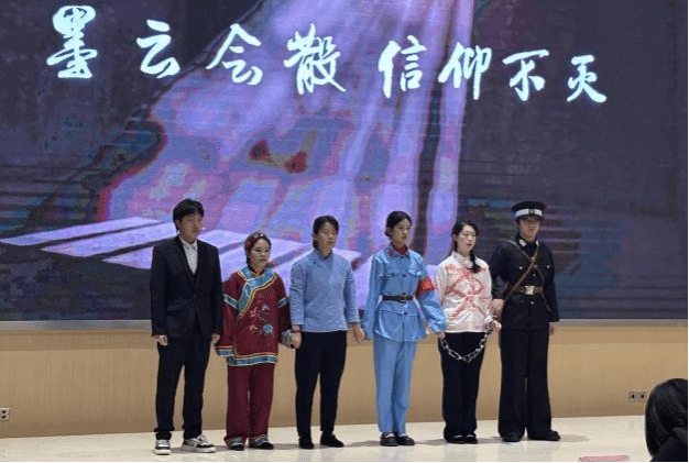 评审会现场,“绿丝带” 志愿服务团队率先带来革命历史话剧《墨云不墨》,陈墨云的庄严宣誓、陈君起赠围巾的温情瞬间及演员谢幕的肃穆神情,尽显对历史细节的精准把握与革命精神的深刻体悟。这部经数次打磨的作品,以艺术化表达带观众穿越时空,真切感受革命先辈于艰难险阻中坚守信仰的赤诚之心。