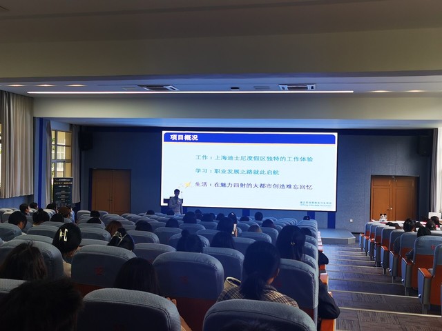 来自嬉戏族集团有限公司招聘主管朱燕燕为大家进行详细介绍,从“认识嬉戏谷”到介绍岗位职责、公司培训体系。来自迪士尼度假区的招聘经理刘天猷从工作、学习、生活三方面向同学们介绍了在迪士尼度假区的各方面体验。