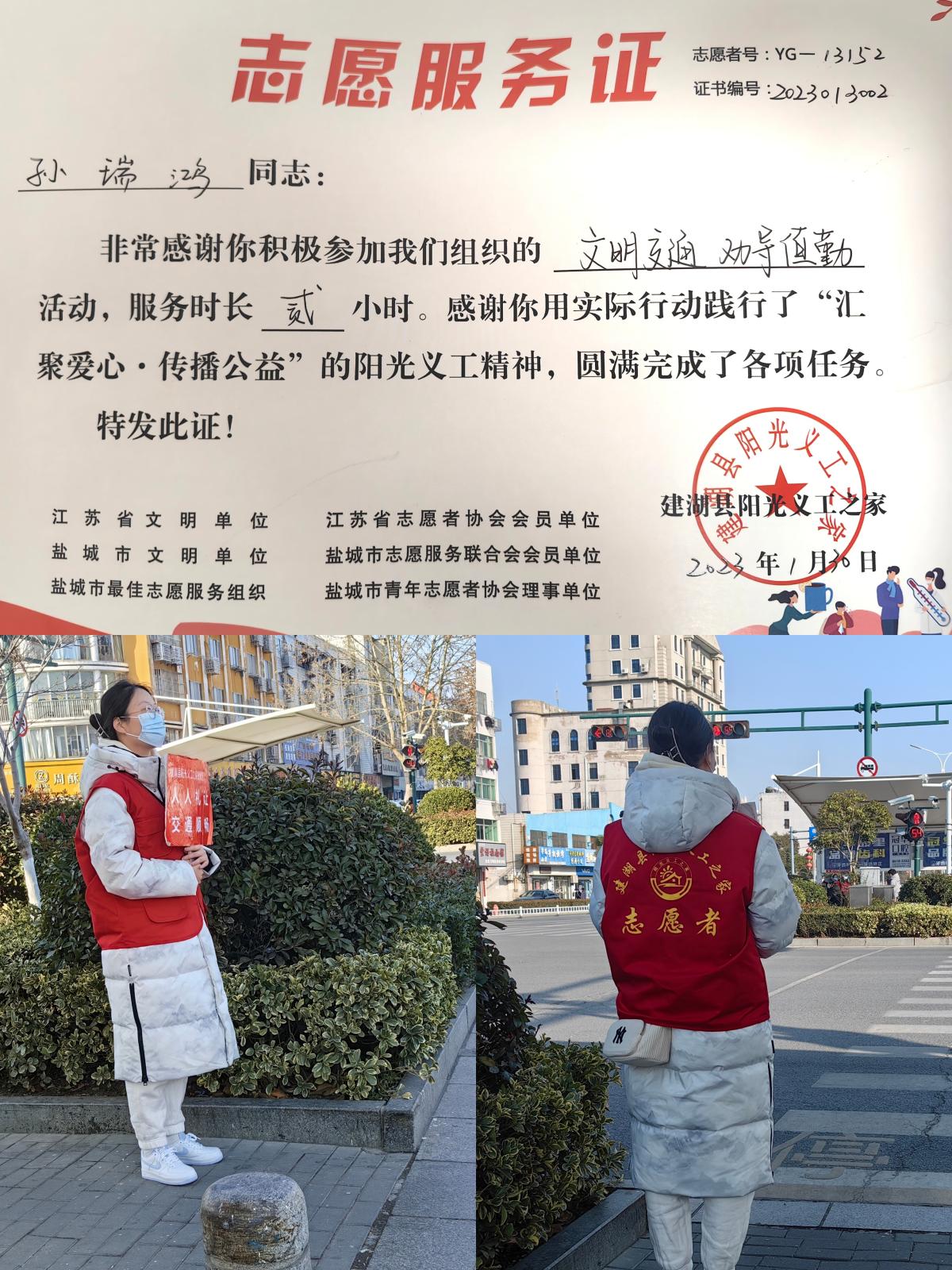 孙瑞鸿的志愿服务工作是在路边做劝导值勤员,需要手拿引导牌,提醒路人不要闯红灯、骑车人员记得戴头盔等。寒风凛冽,她耐心的劝导行人遵守交通法规,她提醒骑电动车的阿姨带好头盔,帮扶行动不便的老人过马路......通过文明劝导的方式,不仅让行人切实感受到了自觉维护交通安全秩序的重要性,也增强了行人遵章守法的自律意识。随着时间一份一秒的过去她的腿渐渐酸麻了起来,但是她工作的热情却丝毫不减,觉得时间过得很快很充实。