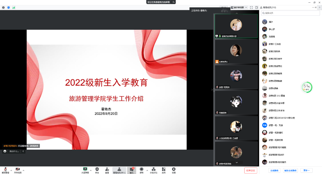 为帮助2022级新生尽快完成角色转换,扣好大学的第一粒纽扣,根据学校开学第一课的工作安排,9月20日,旅游管理学院于线上开展了2022级新生入学教育活动,学院党总支书记张岳军、副书记霍艳杰、全体辅导员以及2022级全体新生参加了此次活动。