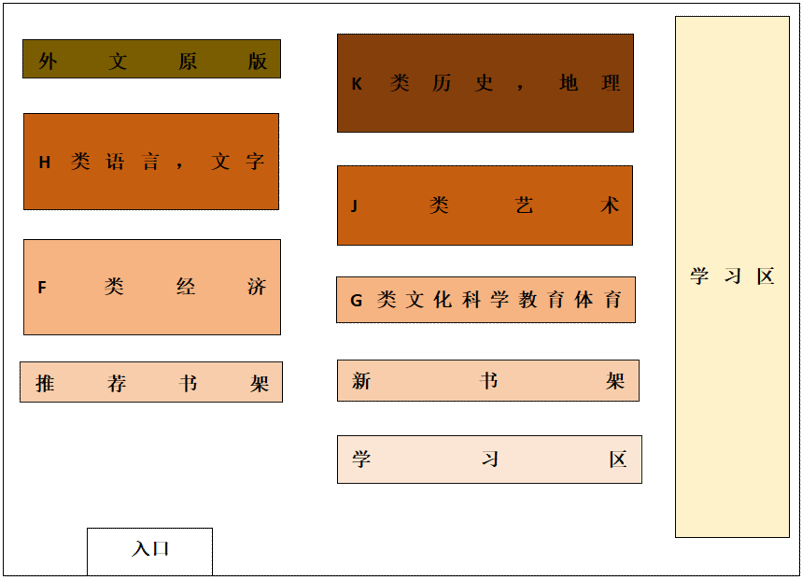 社会科学区(F/G/H/J/K) | 近5年出版的社会科学类图书;原版外文图书;阅览座位(部分座位配备台灯、充电插座);图书查询机