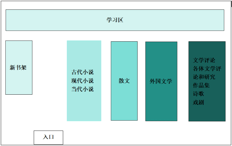 文学区 | 近5年出版的文学类图书;阅览座位(部分座位配备台灯、充电插座);图书检索电脑 |