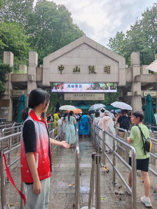 除此之外,团队成员刘思雨同学还在中山陵风景区由中山陵管理委员会组织当景区志愿者。她说:“在中山陵风景区当志愿者可以说是一个一举两得的体验。不仅可以亲身感受到历史与自然的和谐交融,还能帮助游客,特别有意义。在志愿服务的过程中,每当帮助完游客,他们都会对我说一声谢谢,那一刻我真正体会到了志愿者帮助他人的价值,更加坚定了我继续参与志愿服务的决心”。