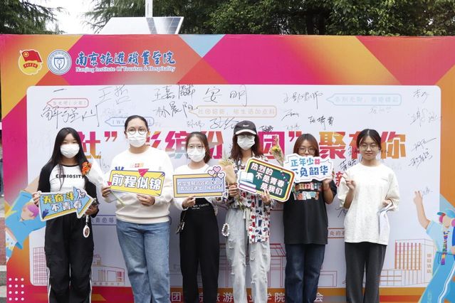 新生在签字板前签字合影