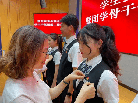 团委老师为新任主席团佩戴工作名牌