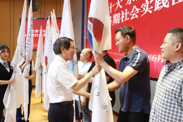 宣誓结束后,周春林为各实践团队授旗。伴随着击鼓声,各团队指导老师舞动旗帜,在师生们“喜迎二十大 永远跟党走 奋进新征程”的嘹亮口号声中,我院2022年暑期社会实践出征的号角正式吹响。