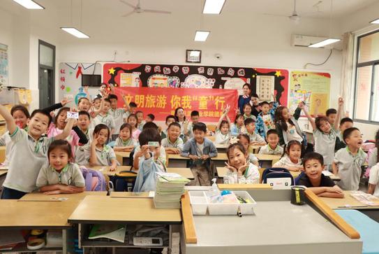 实践活动的第一站,团队成员来到江宁开发区小学开展了“文明旅游,你我‘童’行”的主题宣讲活动,通过生动的讲解、互动问答游戏和模拟飞行体验,激发了孩子们对文明旅游的兴趣与热情。此次活动不仅让小朋友们收获了旅游相关知识,更在他们心中种下了文明旅游的种子,希望小朋友们在今后的旅行中主动做文明旅游的践行者与传播者。