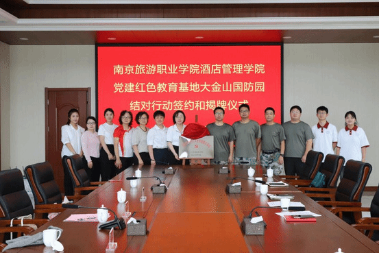 校地双方签署了结对行动协议,共同揭开了“党建引领红色文化实践教育基地”的牌匾。此次结对共建不仅为酒店管理学院金陵“遗”梦志愿团队未来开展暑期社会实践活动提供了平台与资源,更有利于后续做好红色文化遗产探索与挖掘工作,编撰和完善红色文化故事,以非遗文化拓宽红色文化传播途径。