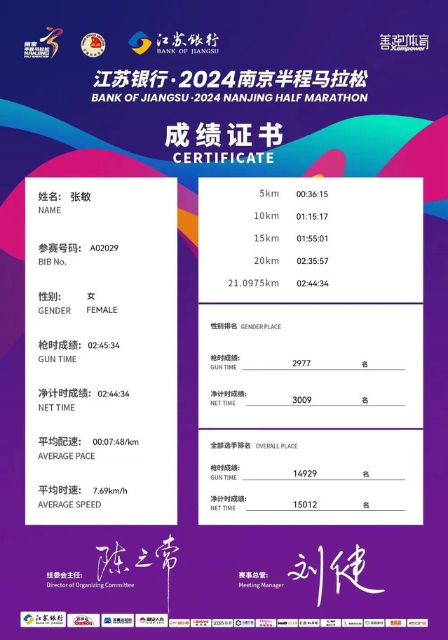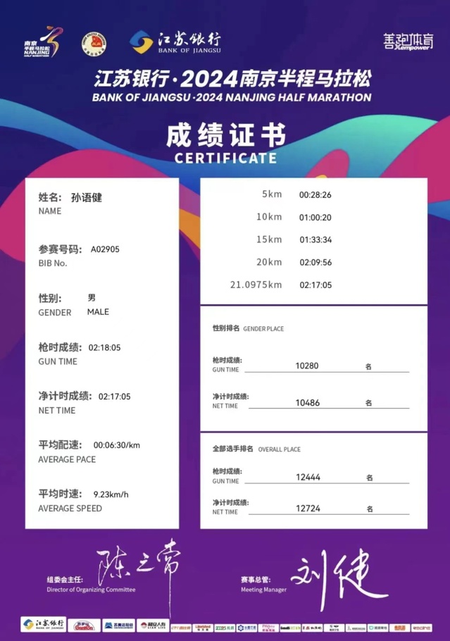 我院团委组织4名师生作为在宁高校跑团参赛。经过前期选拔、训练、报名等工作后,由体育部张敏老师作为领队带领23级空乘5班陈曦、孙语健和23级空乘4班杨梓3位同学参加比赛。赛前刻苦训练、认真备赛,4名队员最终分别以2:10:09、2:17:05、2:45:10、3:03:46取得优异成绩完赛,充分彰显了南旅师生的魅力与风采,成功达成赛前的设定目标,在赛道上绽放青春光彩。