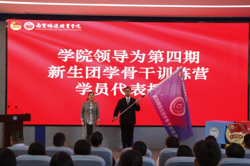 学院党委副书记朱琰为训练营授旗,在旗帜的挥舞中,第四期新生团学骨干训练营扬帆起航。