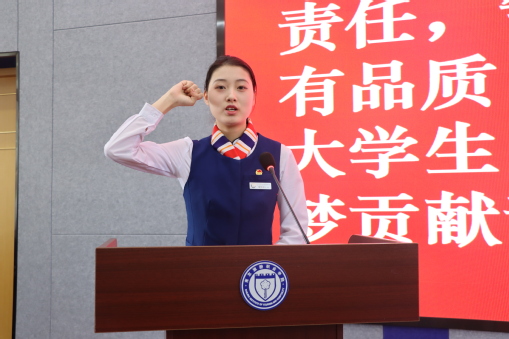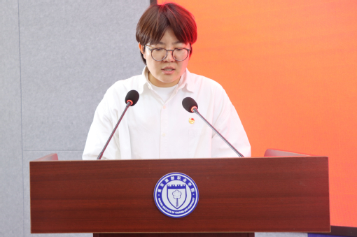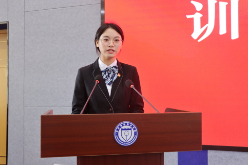 学院第四期新生团学骨干训练营学员代表刘清同学发言,她向学员们发出号召,希望全体学员践行以微笑和知识服务社会的校训,用青春的才干为实现中华民族伟大复兴贡献青春力量。