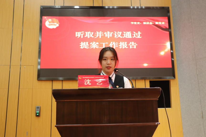 第三届学生联合会主席沈艺同学作提案工作报告。她强调报告中代表们提出了许多建设性的意见和建议,一事一案,一案一表,主题鲜明,具有代表性。同时她表达了对学院相关部门为维护学生权益,服务学生生活辛勤付出的感谢。