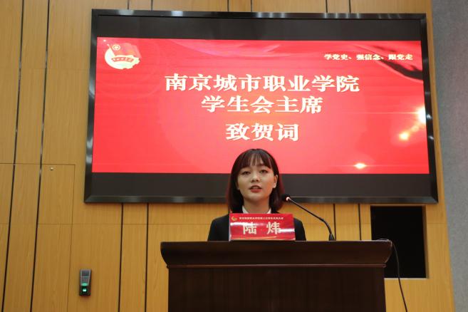 南京城市职业学院学生会主席陆炜在会上致贺词。她表示两院团学组织结下了深厚的友谊,互相学习,相互帮助,共同营造团学组织和谐稳定的新风尚。这次大会的召开,也将加快推进学院学生会工作的新进程,开创团学工作的新局面。