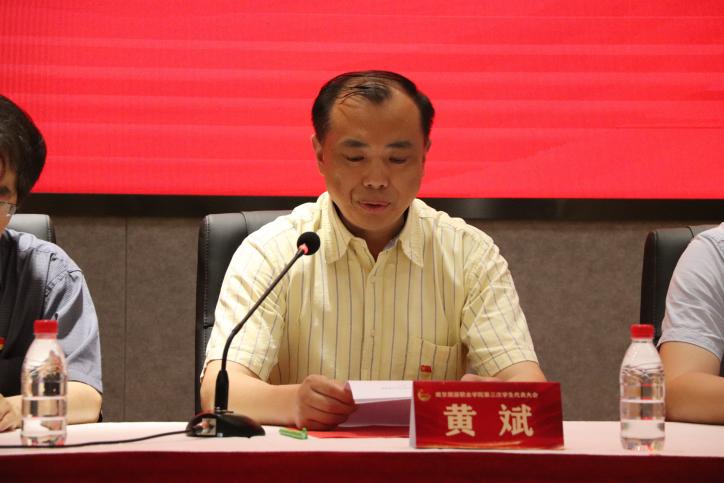 党委副书记、副院长黄斌代表学院党委在会上致贺词。他向大会的召开表示祝贺,他指出学院团委带领学生会走在青年前列,展现了我院青年特有的蓬勃朝气和青春风采,并希望学院学生会在院党委的领导下、团委的指导下,坚守初心使命,把个人理想追求融入党和国家事业之中,以青春之我、奋斗之我谱写青春华章。