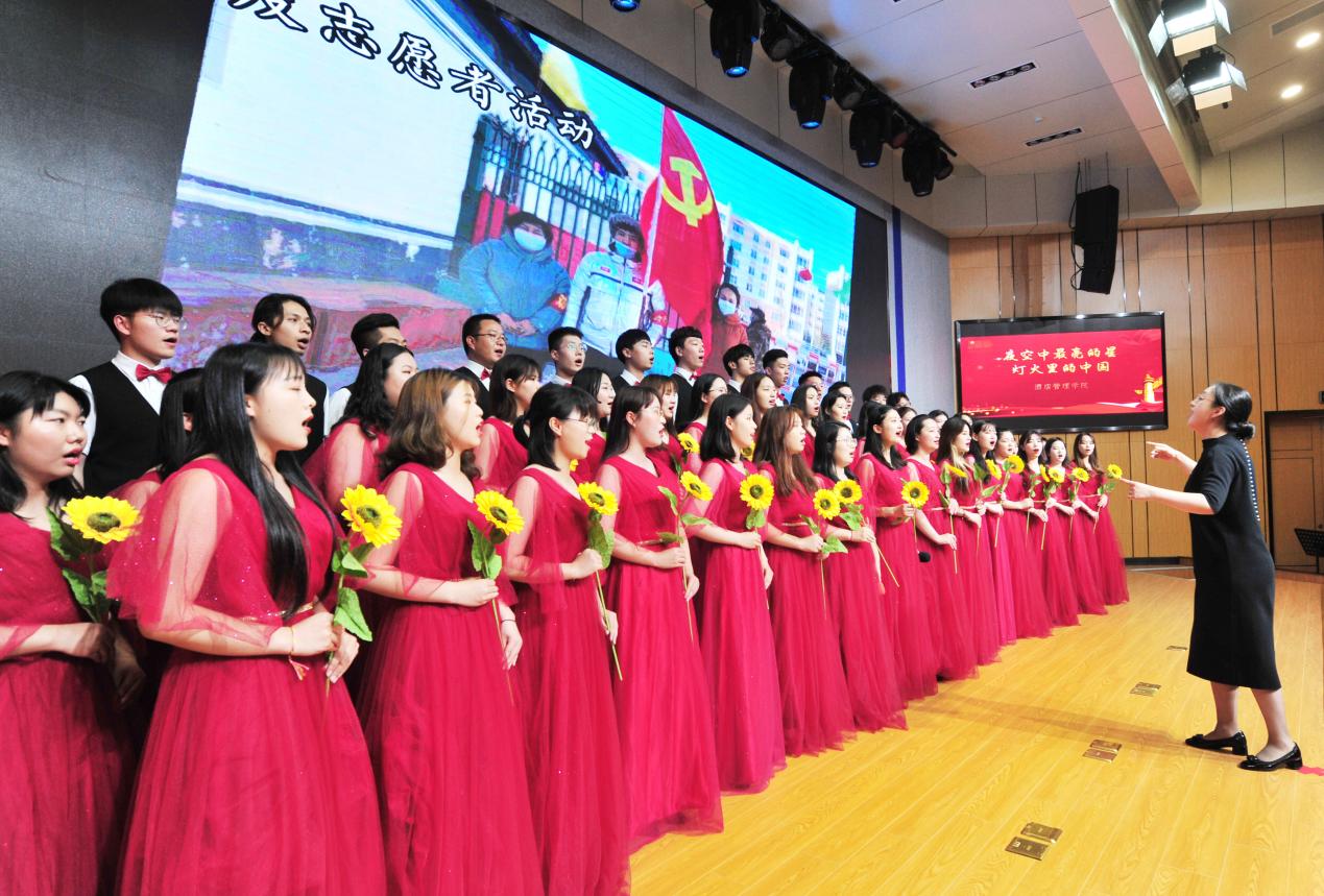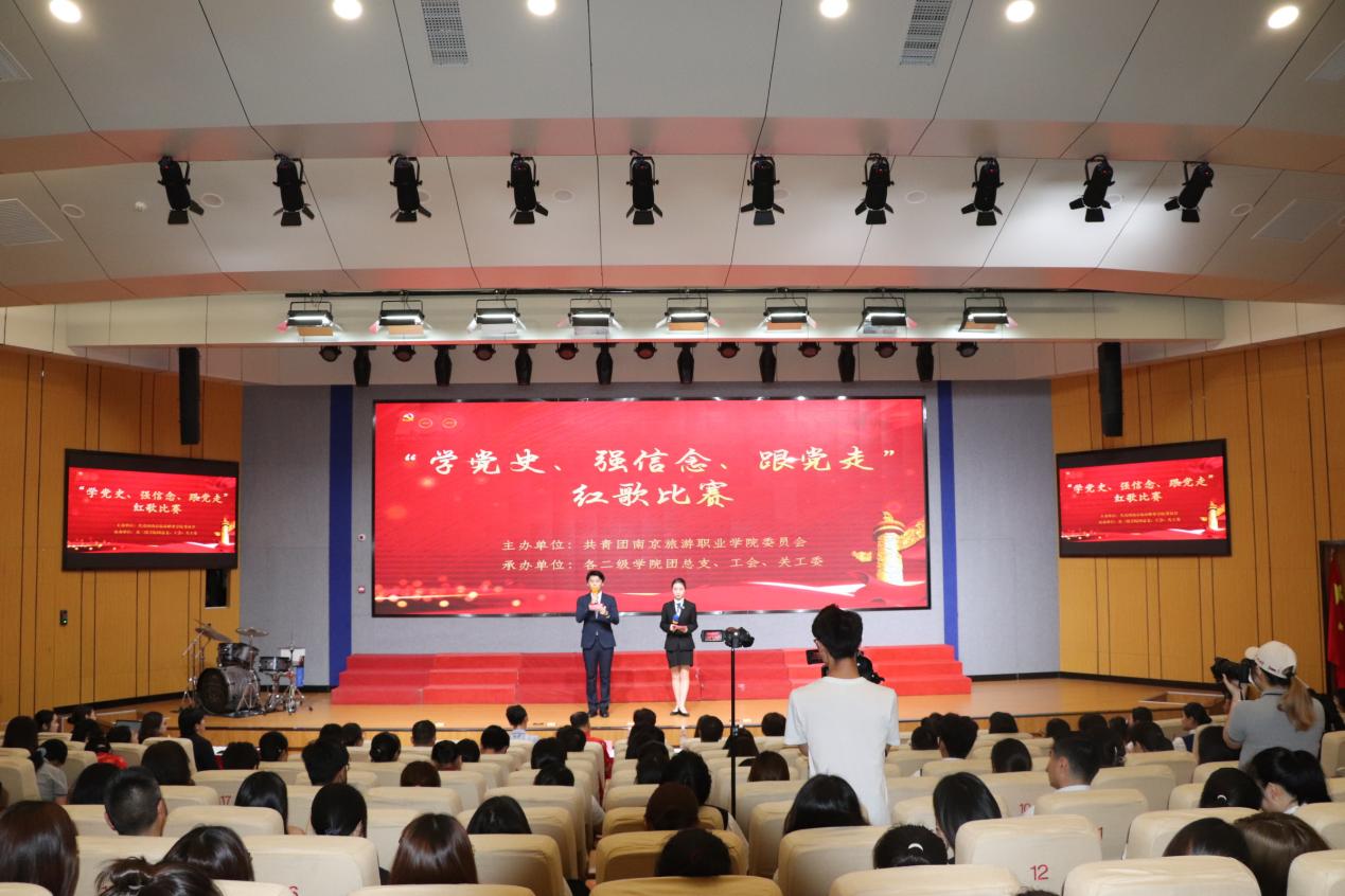 为庆祝中国共产党成立100周年,切实开展党史学习教育,唱响时代主旋律,进一步引导广大青年厚植爱党、爱国、爱社会主义的情感。6月16日下午2:00,由院团委主办,各二级学院团总支、工会、关工委承办的“学党史、强信念、跟党走”红歌比赛在图书馆报告厅隆重举行。学院领导班子、各职能处室负责人、二级学院党总支(副)书记、团总支书记、教职工代表以及300余名学生一同观赏了这场红色的视听盛宴。比赛的评委由原南京旅游职业学院院长张新南,教务处处长孙爱民,招生就业处副处长姚颖,学工处副处长陈海艳,工会副主席戚君子担任。