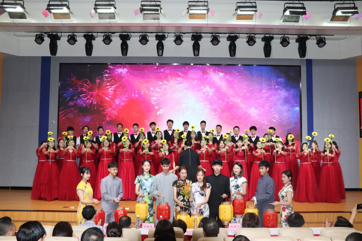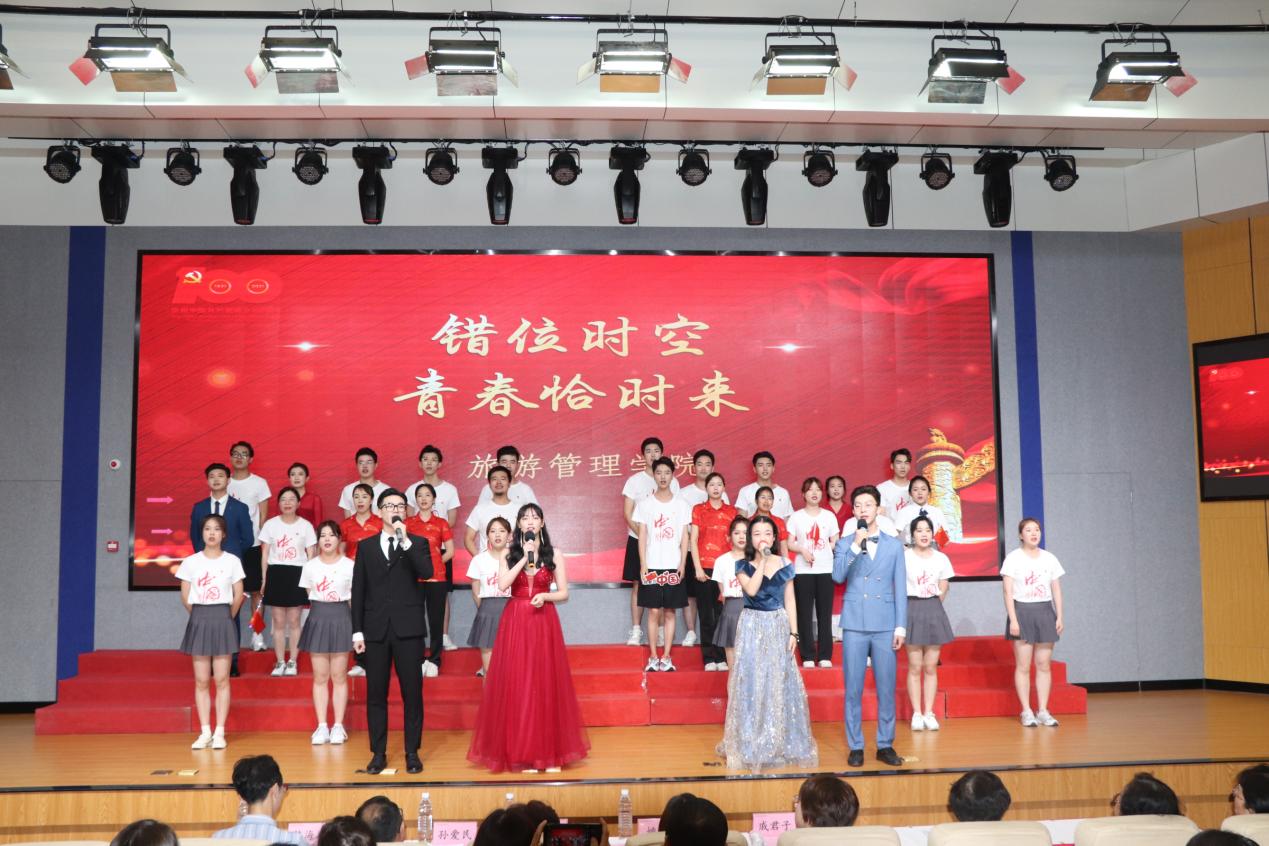比赛现场,5支学院合唱队依次上台表演,舞台表现形式丰富多彩,融合舞蹈、朗诵等,运用精心构思的视频与道具,营造出良好的舞台氛围,充分展现出南旅学子的朝气蓬勃和对祖国的热爱情怀。其中,人文艺术学院的合唱热烈恢弘,坚定了同学们始终听党话、永远跟党走的决心,优美动人抒发着对祖国深沉的爱意。烹饪与营养学院的合唱铿锵有力,在歌声祖国的旋律里,让同学们更坚定了我们的答案就是脚下的这片热土;旅游管理学院的合唱活泼靓丽,在与革命先辈们穿越百年时空的对话中,赓续着青春薪火,唱响新时代大好的未来。酒店管理学院的合唱宛转悠扬,点点星光汇聚成璀璨星河,我们愿化作满天星,照亮这青春婀娜的中国;旅游外语学院的合唱振聋发聩,仿若庄严宣誓,当祖国召唤的时候,我们必将义无反顾、赓续奋斗。最后,院团委、学生联合会带来一曲《少年》,将现场的气氛推向高潮!