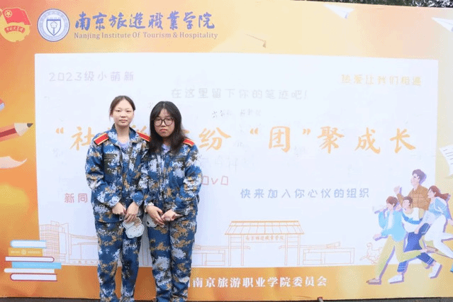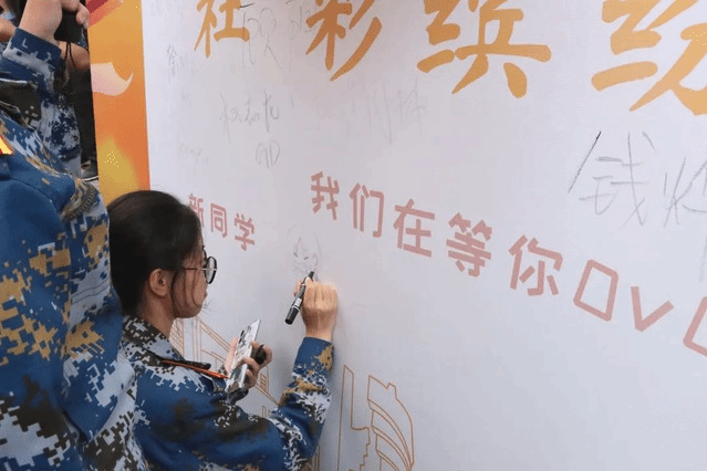 新生在签字板前打卡合影