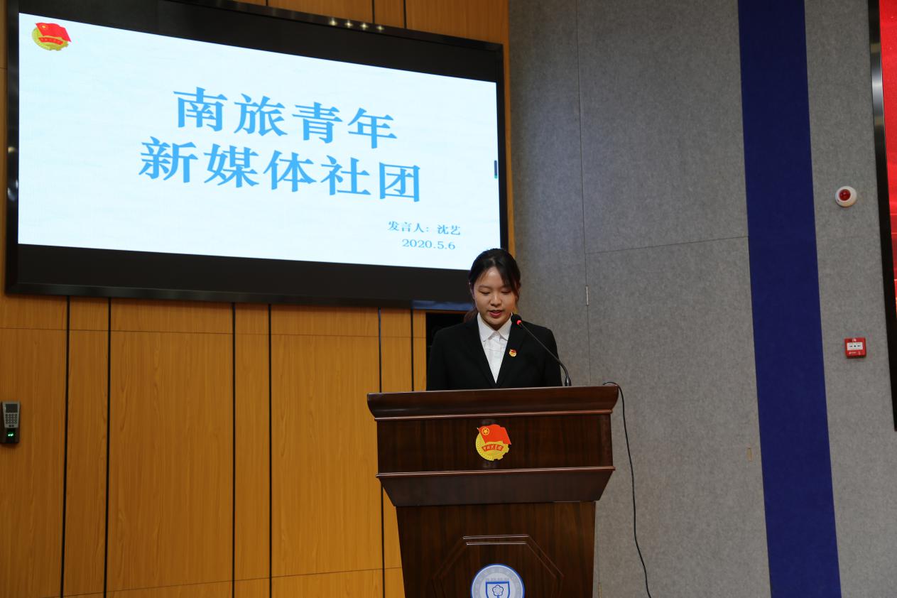 南旅青年新媒体社团干部代表沈艺用数字展示了社团的四大块工作内容,用自身经历和感受分享了社团带给自己的收获和感动,她说:“社团带着我成长,教会我热爱”;燕歌读书会社团干部代表屠雪莲通过举办的活动展示了社团风采,倡议同学们利用第二课堂开展阅读推广活动,营造愉悦的读书氛围;习研会社团指导老师尚全作为优秀社团指导老师代表发言,他表示要用心、用力、用情,做好学生成长的引路人。