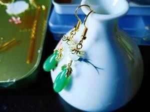 金色的外表下点缀着几颗珍珠尽显端庄 梅花下坠着玉石尽显高雅
