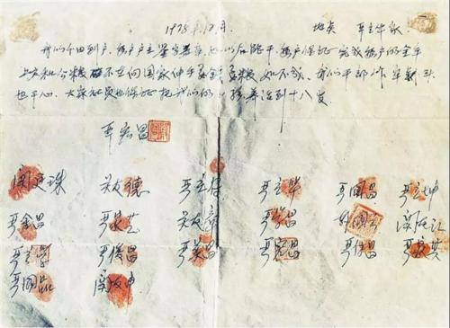 “我们分田单干,每户户主签字盖章,如以后能干,每户保证每户的全年上交和公粮,不再向国家伸手要钱要粮。如不成,我们干部坐牢杀头也甘心,大家社员也保证把我们的小孩养活到十八岁。”