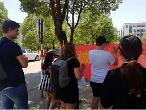 在活动中,学生志愿者通过现场宣传和邀请的方式,使得老师和同学们纷纷驻足,在横幅上签下自己的名字。同学们表示会从自己做起,从身边做起,为树立诚信学风,创建诚信校园,建立诚信社会做出自己的贡献。活跃的气氛也让路过的外国交换生们纷纷停驻,他们也积极地参与到本次诚信教育签字活动中。外教托马斯老师与同学们分享了他对诚信的认知,如:“不偷东西,不在考试时作弊,不欺骗别人”等,他认为,在人际交往中诚信是非常重要的一种品质。