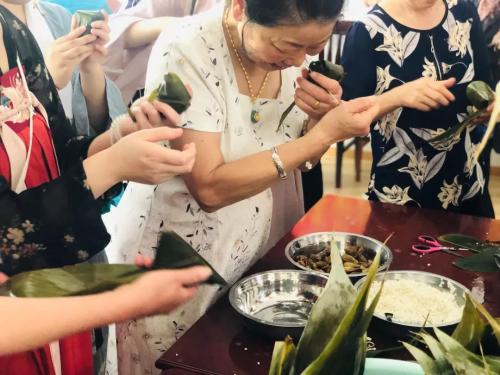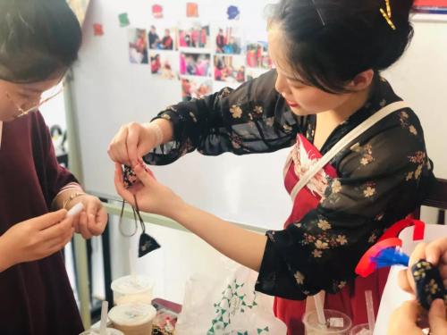 活动开始,首先由社团的同学们为社区居民表演了舞蹈“牵丝戏”和“丝路”并普及端午知识,让大家了解端午节的相关来历、传说故事和习俗活动,感受传统节日浓郁文化气息。随后开展了包粽子和做香囊等民俗活动,大家精神饱满、劲头十足,边拉家常,边切磋技艺,还现场传授包粽子的经验技巧。整个活动现场一片欢声笑语、热闹非凡。